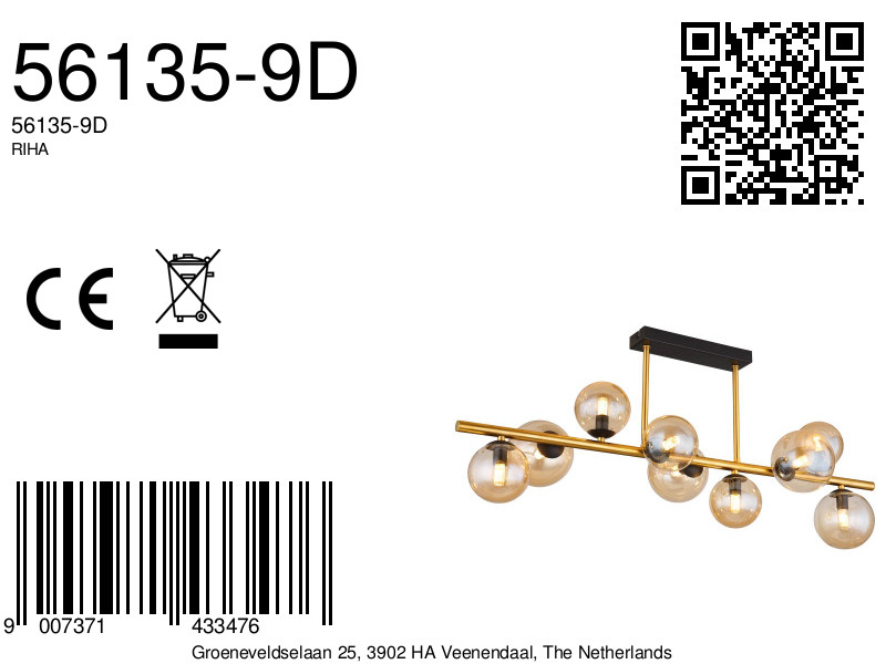 Deze stijlvolle plafondlamp uit de Riha serie is een echte blikvanger in uw interieur. Bevestigd aan een smalle zwarte plafondbeugel, loopt een elegant ontworpen metalen stang van 87 cm omhoog, waaraan twee messingkleurige stangen zijn bevestigd. Het geheel biedt plaats aan maar liefst negen G9 LED-lampen, elk afgewerkt met een prachtige amberkleurige glazen kap. Deze combinatie van materialen en kleurintonaties voegt een luxe uitstraling toe aan uw woonkamer.