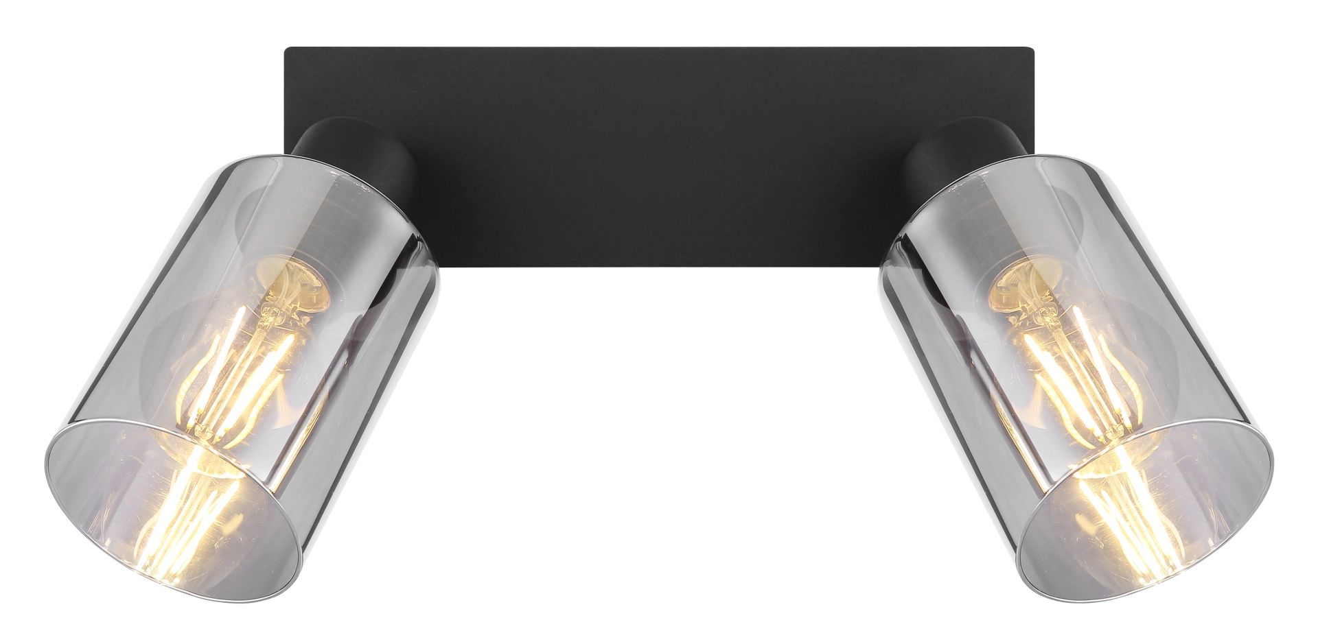 Deze prachtige spotlight is een waardevolle toevoeging voor elk interieur en beschikt over een schitterend ontwerp. De smalle behuizing van zwart mat metaal meet 27×9 cm en is uitgerust met twee E27 fittingen. Elke fitting is voorzien van een elegante cilindervormige kap, uitgevoerd in sfeervol rookglas met een diameter van 9 cm. Dit stelt u in staat om zelf de lichtkleur en helderheid te kiezen, met een maximaal wattage van 40 watt.