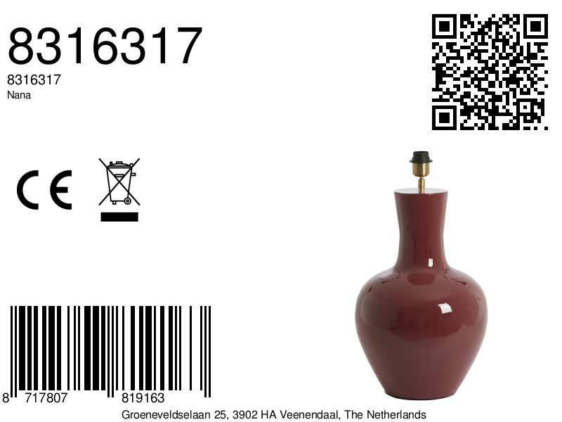 De Light & Living tafellamp Nana in glanzend bordeauxrood brengt warmte en elegantie in je interieur. Met een diameter van 33 cm en een hoogte van 51 cm heeft de lamp een compact formaat dat ideaal is voor tafels, dressoirs en nachtkastjes. De glanzende afwerking op het stevige metalen materiaal zorgt voor een luxe uitstraling en past bij zowel moderne als vintage woonstijlen. De lamp beschikt over een E27 fitting en wordt geleverd zonder lichtbron, waardoor je zelf een passende lichtbron kunt kiezen. Bediening gaat eenvoudig met de snoerschakelaar en de lamp is dimbaar wanneer je een geschikte lichtbron gebruikt. Met IP20 klasse is de lamp enkel geschikt voor binnenruimtes.