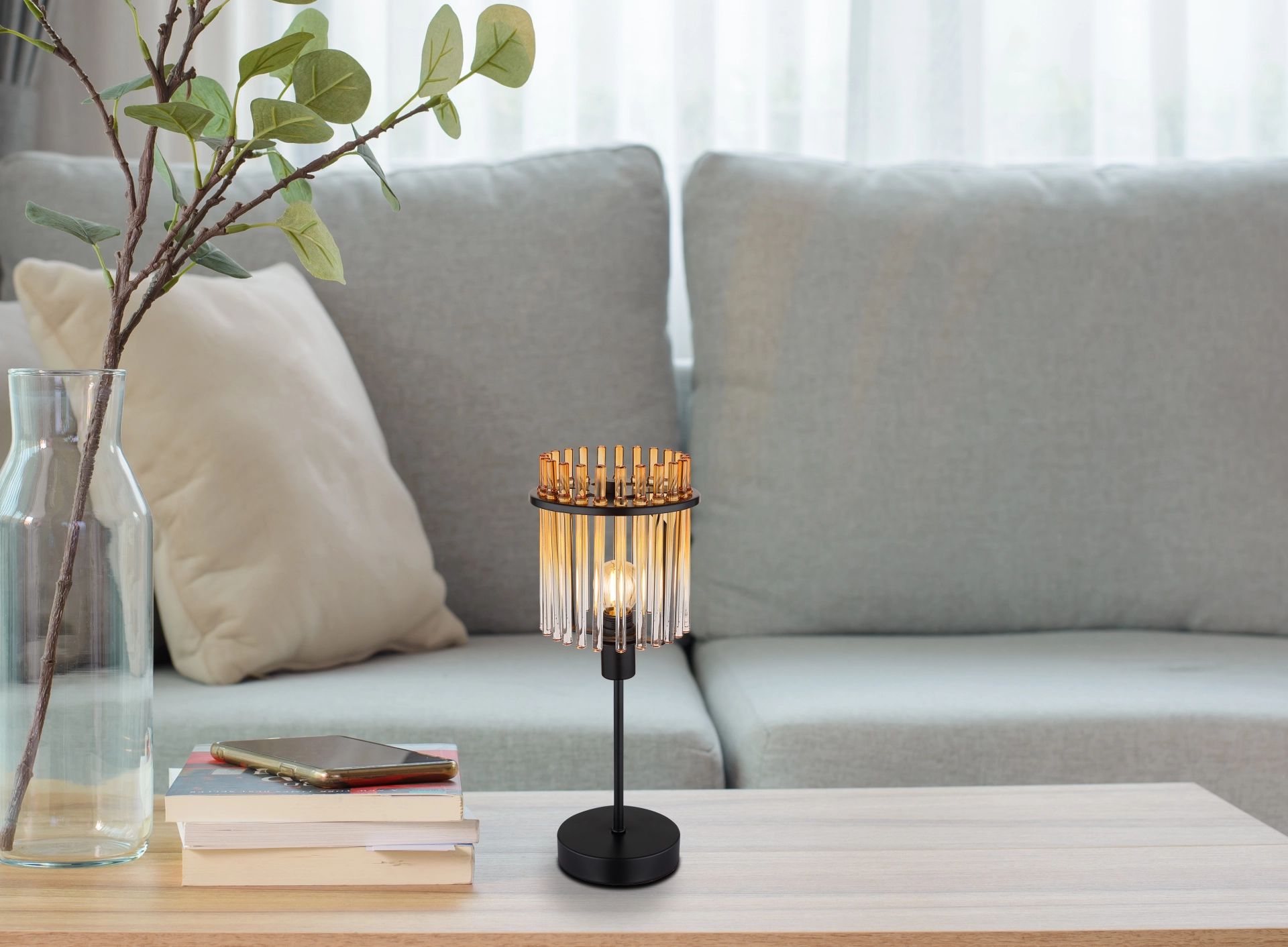 De GORLEY tafellamp combineert elegante vormgeving met praktische functionaliteit. Met zijn ronde body van mat zwart metaal en een bijpassende kap van amberkleurige en heldere glazen staven, zorgt deze lamp voor een sfeervol lichtspel in uw woonruimte. Dankzij het warme licht creëert de GORLEY tafellamp een gezellige ambiance, waardoor hij perfect geschikt is als stijlvol verlichtingsaccent voor bureaus, nachtkastjes of consoles in diverse ruimtes zoals woonkamers, slaapkamers of kantoren.