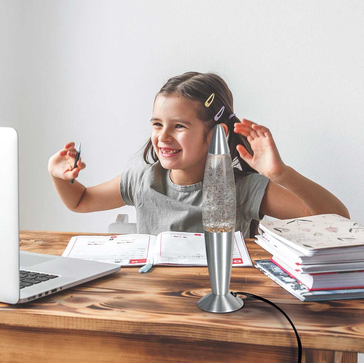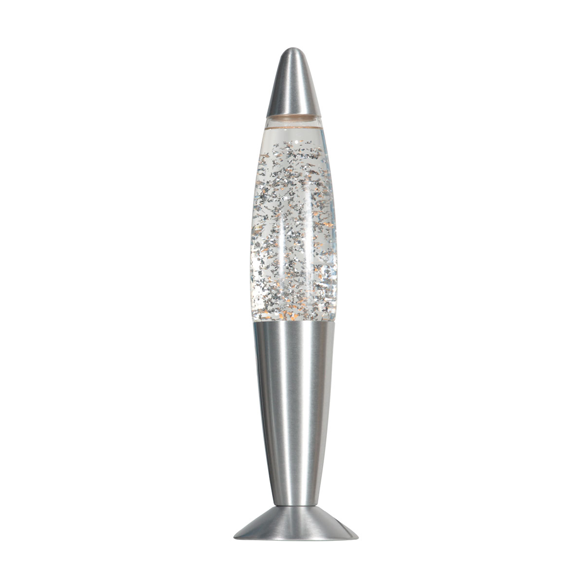 De Volcan glitter tafellamp van Mexlite brengt een speelse en magische sfeer in huis. Deze retro lavalamp heeft een unieke stalen raketvorm en een transparante fles waarin glitters bewegen door de warmte van de lichtbron. Dit zorgt voor een rustgevend en hypnotiserend effect. Met een compacte hoogte van 35 cm en een diameter van 9 cm past de lamp perfect op een nachtkastje, bureau of dressoir.
