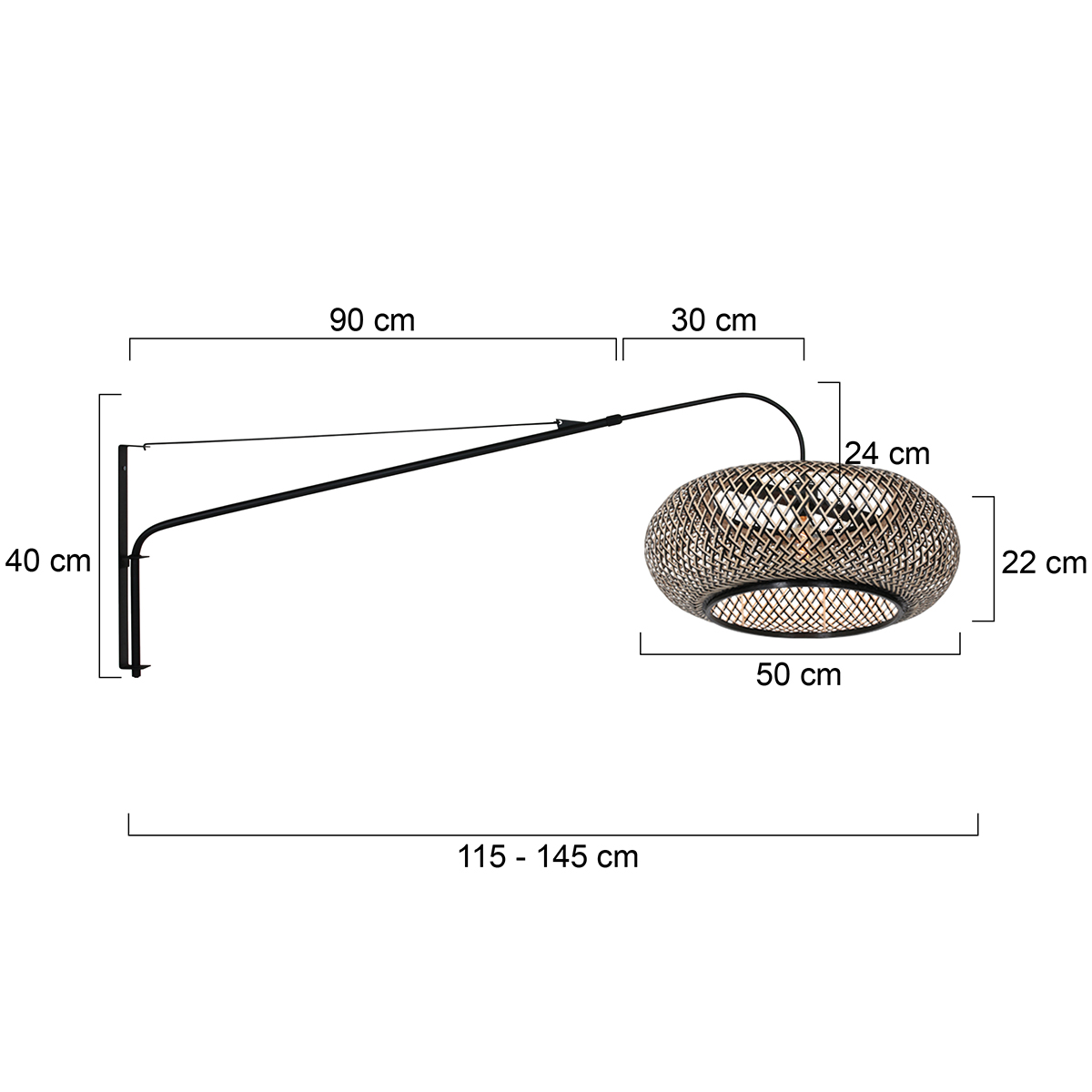 Deze lange wandlamp is voorzien van een verstelbare reikwijdte van 120 tot 150 cm, ideaal boven een zithoek, tafel of bed. Het zwarte metalen armatuur wordt gecombineerd met een bamboe kap in naturel-zwart, wat zorgt voor een eigentijdse en warme uitstraling. De royale kap van 60 cm geeft sfeervol, diffuus licht.