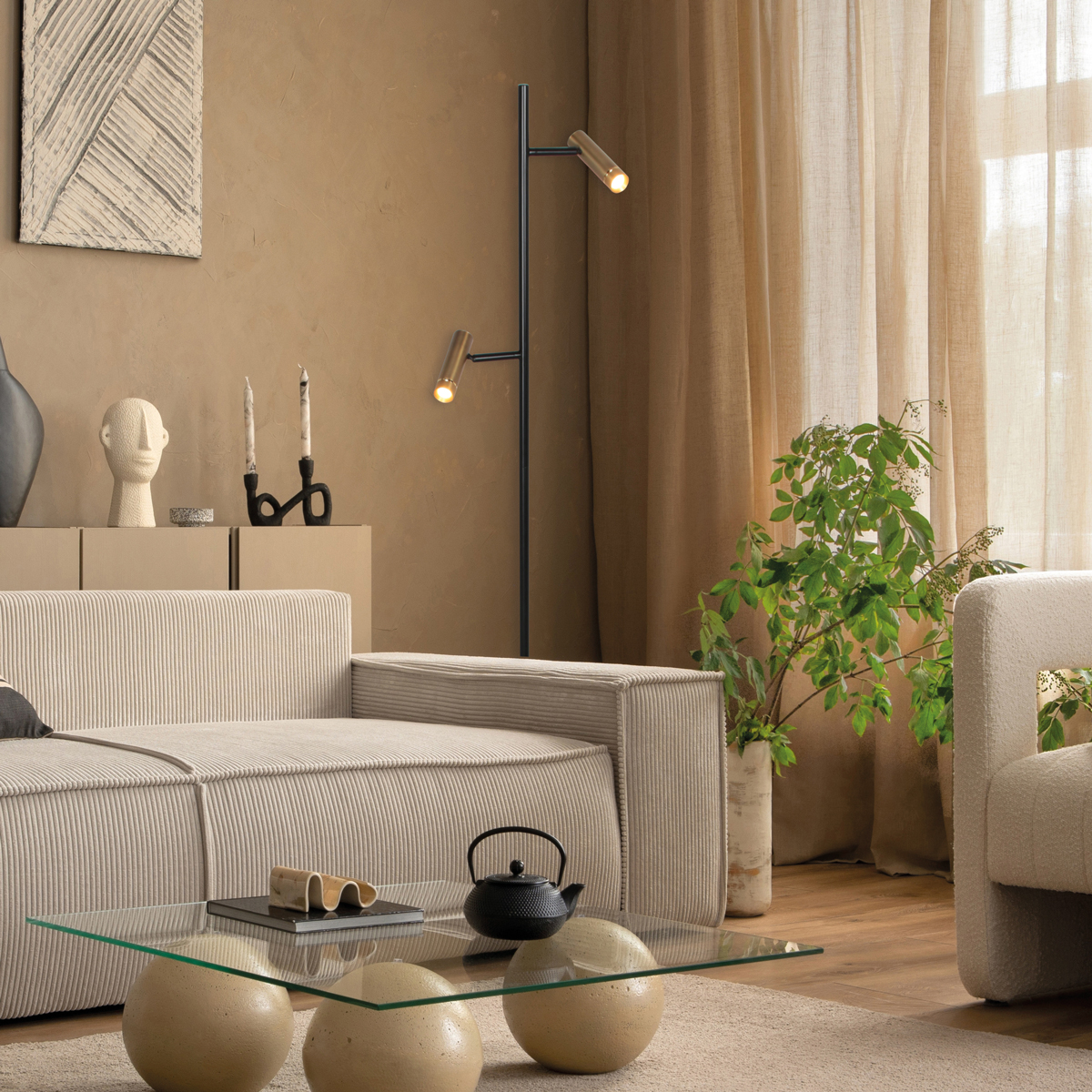 De Lumo 4608BR is een veelzijdige vloerlamp met twee verstelbare lichtpunten en een stijlvolle combinatie van zwart met bronzen accenten. Dit zorgt voor een warme en moderne uitstraling in elk interieur.