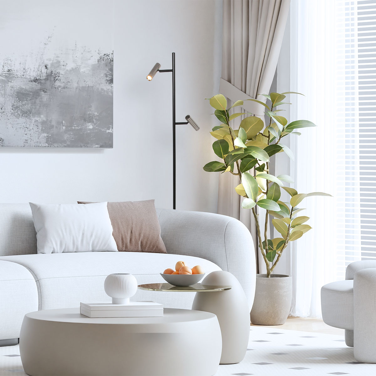 De Lumo 4608ST combineert een strak zwart armatuur met twee stalen lichtpunten, wat zorgt voor een moderne en industriële uitstraling. Met een hoogte van 125 cm is deze lamp compact en praktisch in gebruik.