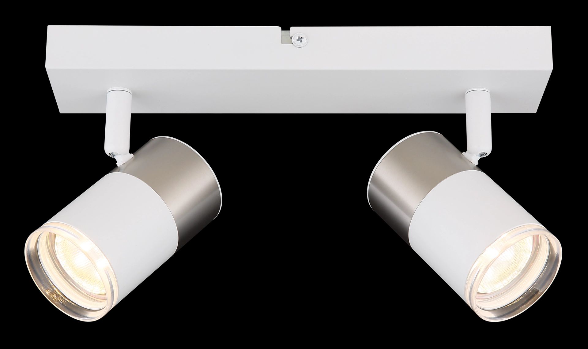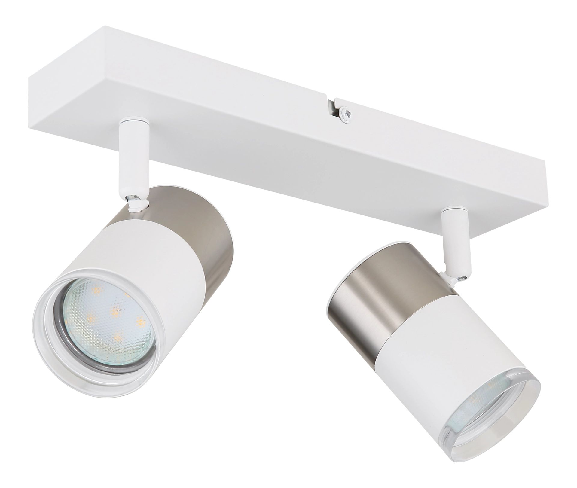 De rechthoekige wandlamp met cilindrische spotlights en een decoratieve ring biedt de ideale verlichtingsoplossing voor hedendaagse woonruimtes. Deze stijlvolle spotlight is vervaardigd uit wit metaal en is uitgerust met twee GU10 spotlights, die samen een vermogen van 25W leveren. Dit zorgt voor een helder licht dat elke ruimte prachtig verlicht en een uitnodigende sfeer creëert. De lampenkappen zijn vervaardigd uit een combinatie van nikkel en wit aluminium, wat samen met het transparante plastic bijdraagt aan het moderne ontwerp.