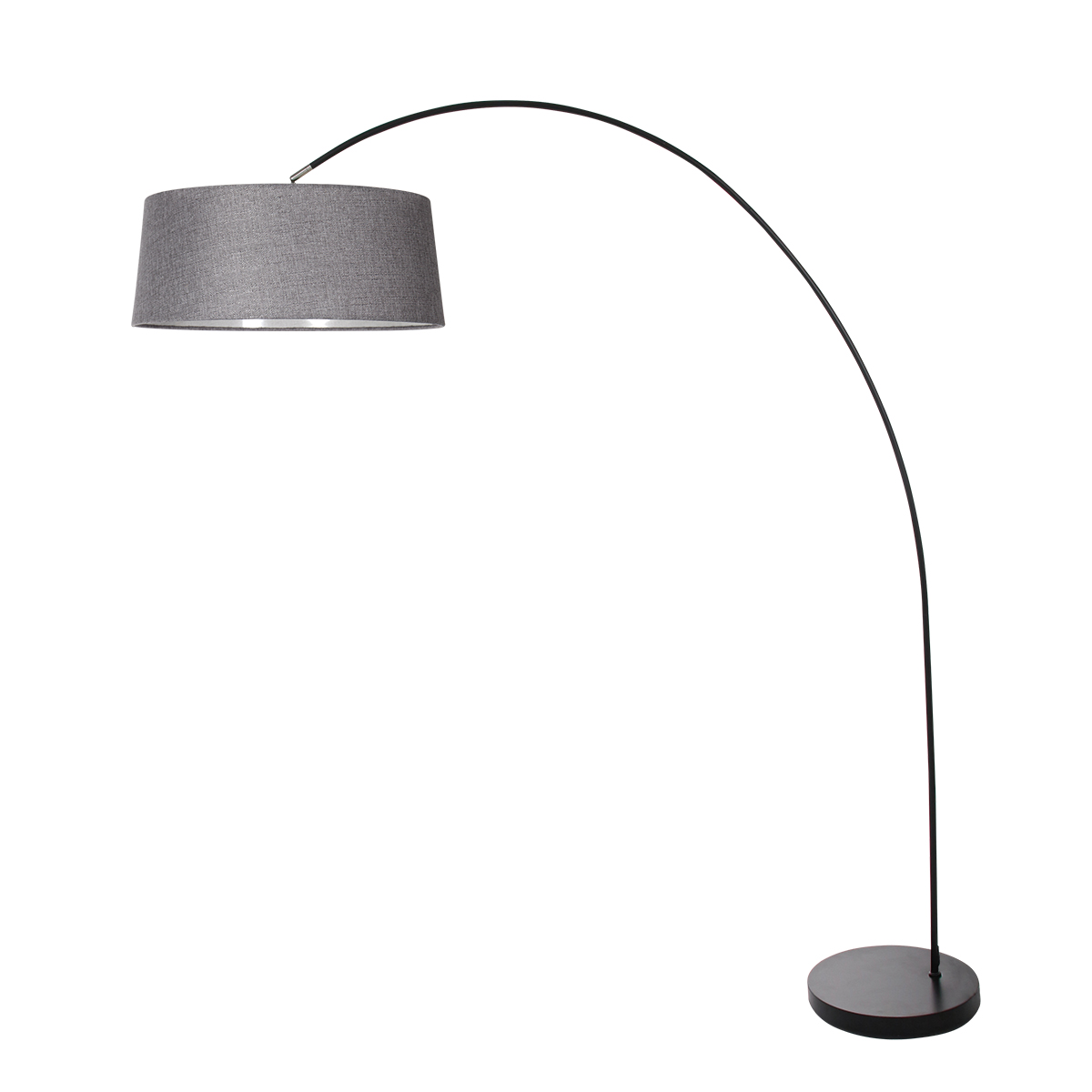 De grijze linnen kap met 48 centimeter onderdiameter, 44 centimeter bovenzijde en 19 centimeter hoogte geeft de booglamp een rustige en eigentijdse uitstraling. De natuurlijke stof in combinatie met de witte binnenzijde zorgt voor een heldere maar niet verblindende lichtspreiding. Deze set is bijzonder geschikt om een zithoek, leesplek of hoek van de woonkamer stijlvol uit te lichten.