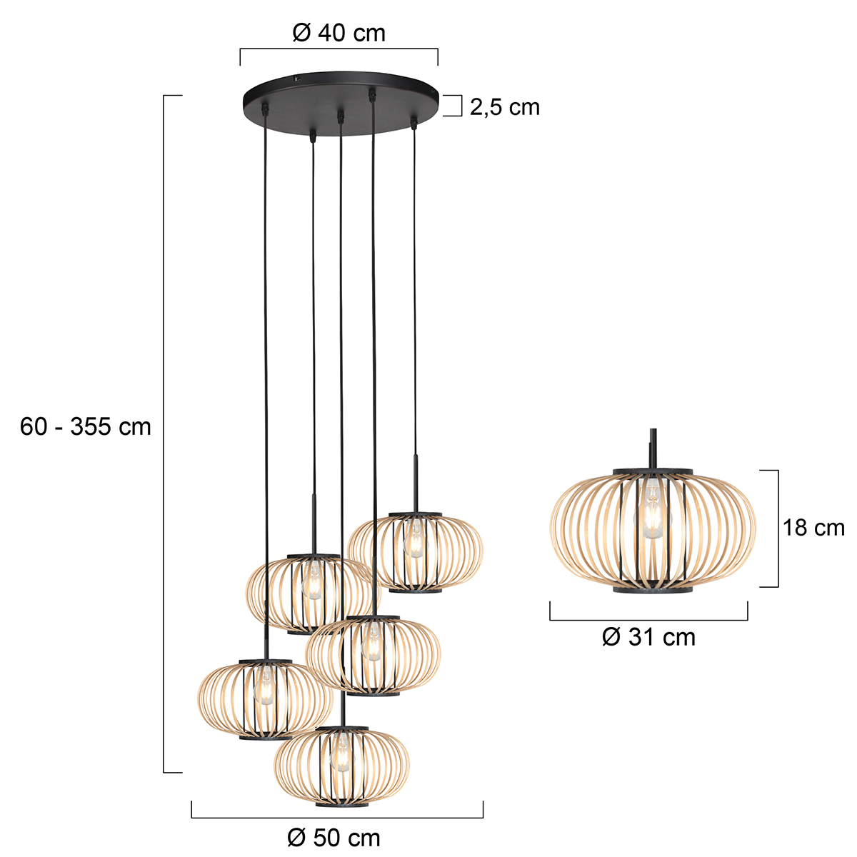 Deze ronde zwarte hanglamp met vijf lichtpunten wordt in deze combinatie geleverd met vijf compacte bamboekappen, waardoor je een speelse en natuurlijke blikvanger boven de tafel of in een vide creëert. De armatuur heeft vijf E27 fittingen aan luxe strijkijzersnoeren van maximaal ongeveer 320 centimeter lang, zodat je de lichtpunten op verschillende hoogtes kunt hangen. Hierdoor is de lamp ideaal voor hoge ruimtes zoals een trappenhal, vide of fraaie entree, maar ook als lager hangende plafondlamp wanneer je de snoeren korter instelt.