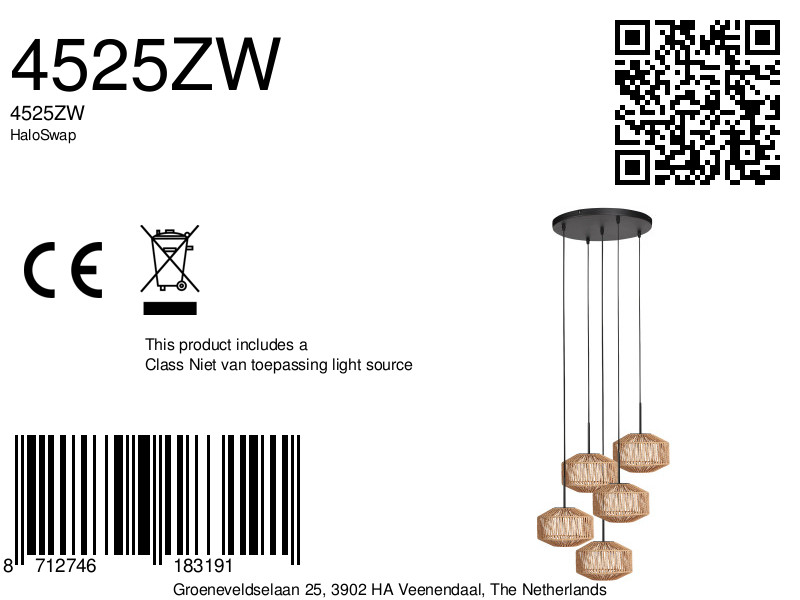 In deze uitvoering wordt de ronde zwarte hanglamp gecombineerd met vijf compacte touwlampenkappen, wat zorgt voor een warme en huiselijke uitstraling. De vijf E27 fittingen hangen aan strijkijzersnoeren van maximaal ongeveer 320 centimeter, zodat je de lichtpunten speels kunt verdelen in hoogte. Dit maakt de lamp ideaal voor boven een eettafel, in een hoge hal of als blikvanger in een vide. Door de lange snoeren kun je de opstelling volledig aanpassen aan de ruimte.