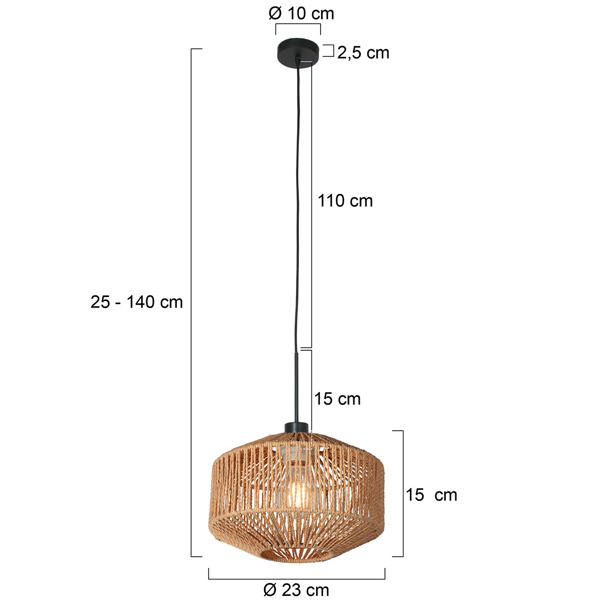 De zwarte pendel uit de Sparkled Light serie krijgt een warme, natuurlijke uitstraling in combinatie met de touwlampenkap van 23 bij 15,5 centimeter. Het armatuur is in hoogte verstelbaar en heeft een zwarte afwerking die zich moeiteloos laat combineren met diverse stijlen. De E27 fitting biedt ruimte voor uiteenlopende lichtbronnen.