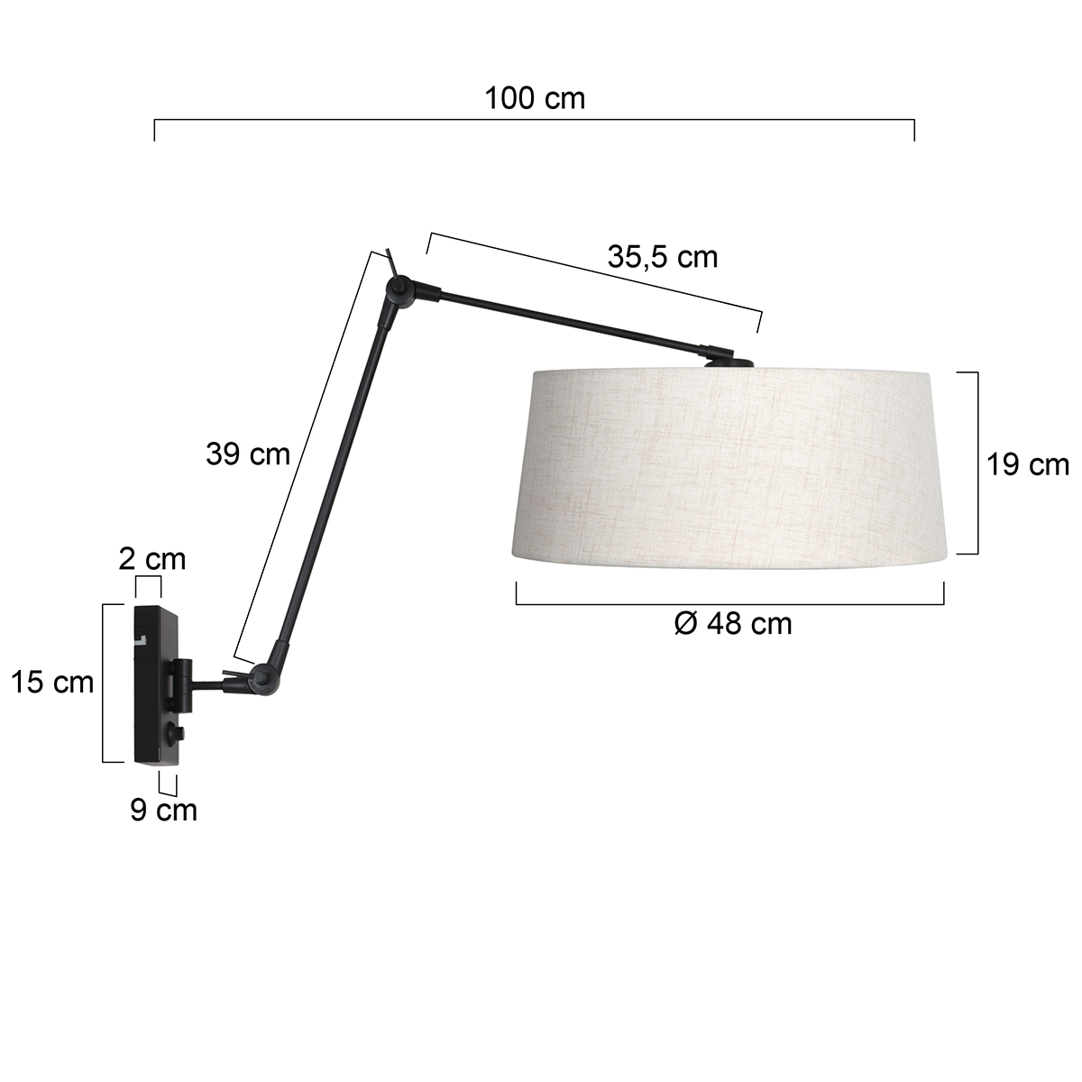 Deze set combineert de zwarte wandlamp uit de Prestige Chic serie met een crèmekleurige linnen kap van 48 centimeter. De wandlamp heeft een lange zwenkarm met vier verstelpunten waardoor je het licht perfect kunt richten. De reikwijdte bedraagt 88,5 centimeter en dankzij de kantelbare E27 fitting blijft de kap altijd mooi recht hangen. De dimmer is ingebouwd in de wandplaat en de lamp wordt geleverd met een aansluitsnoer met stekker.