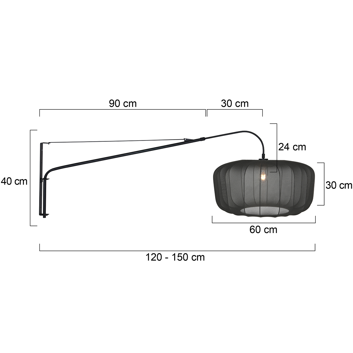Deze zwarte wandlamp uit de Elegant Classy serie vormt een stijlvolle en krachtige combinatie met een royale zwarte lampenkap van 60 centimeter diameter en 30 centimeter hoogte. Het armatuur beschikt over een uitschuifbare arm van 90 tot 120 centimeter en een kantelbare E27 fitting, waardoor de kap altijd netjes recht blijft hangen. Dankzij het 180 centimeter lange snoer met schakelaar is de lamp eenvoudig te bedienen en flexibel te plaatsen.